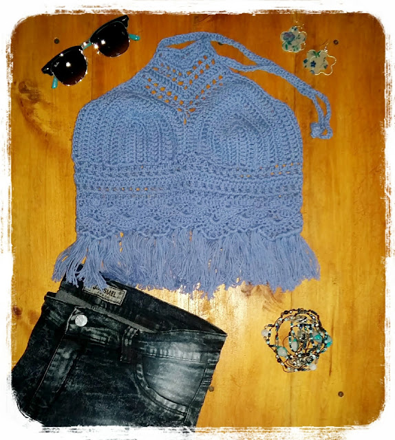 Lo realicé con hilo peruano en un color celeste pastel que me pareció precioso. El diseño le corresponde a Mermaidcat Designs, aunque le he hecho alguna variante. He seguido las indicaciones del patrón para un tamaño L, y me ha quedado muy pequeño - me refiero al que ha quedado muy corto -, así que al finalizarlo, le tejí un borde siguiendo el mismo patrón de la parte superior del top - o parecido -, que si bien no es mucho, me ha quedado mejor.